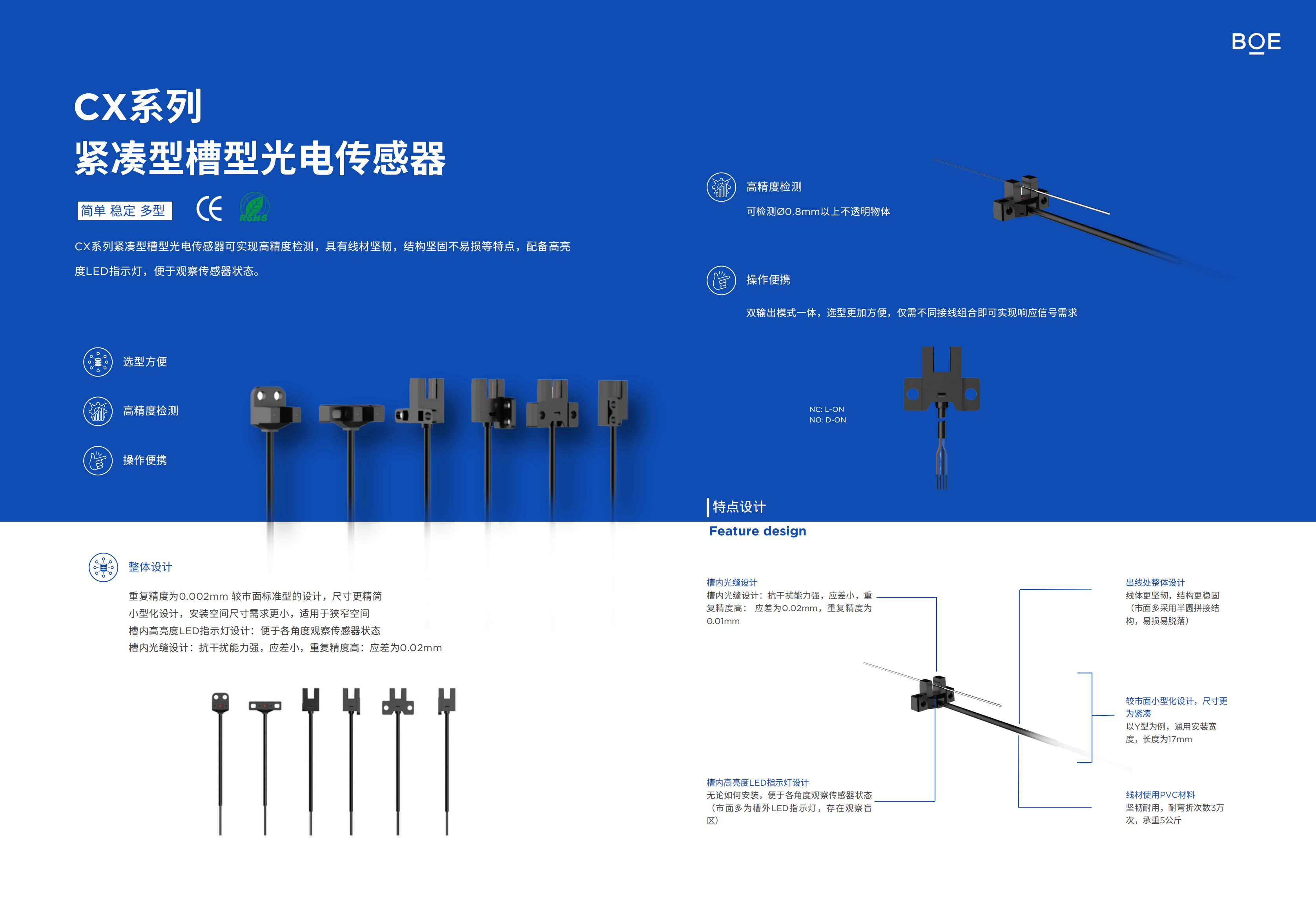 CX系列紧凑型槽型光电传感器可实现⾼精度检测,,,,具有线材坚韧,,,结构坚固不易损等特点,,配备⾼亮度LED指⽰灯,,便于观察传感器状态。。。。
