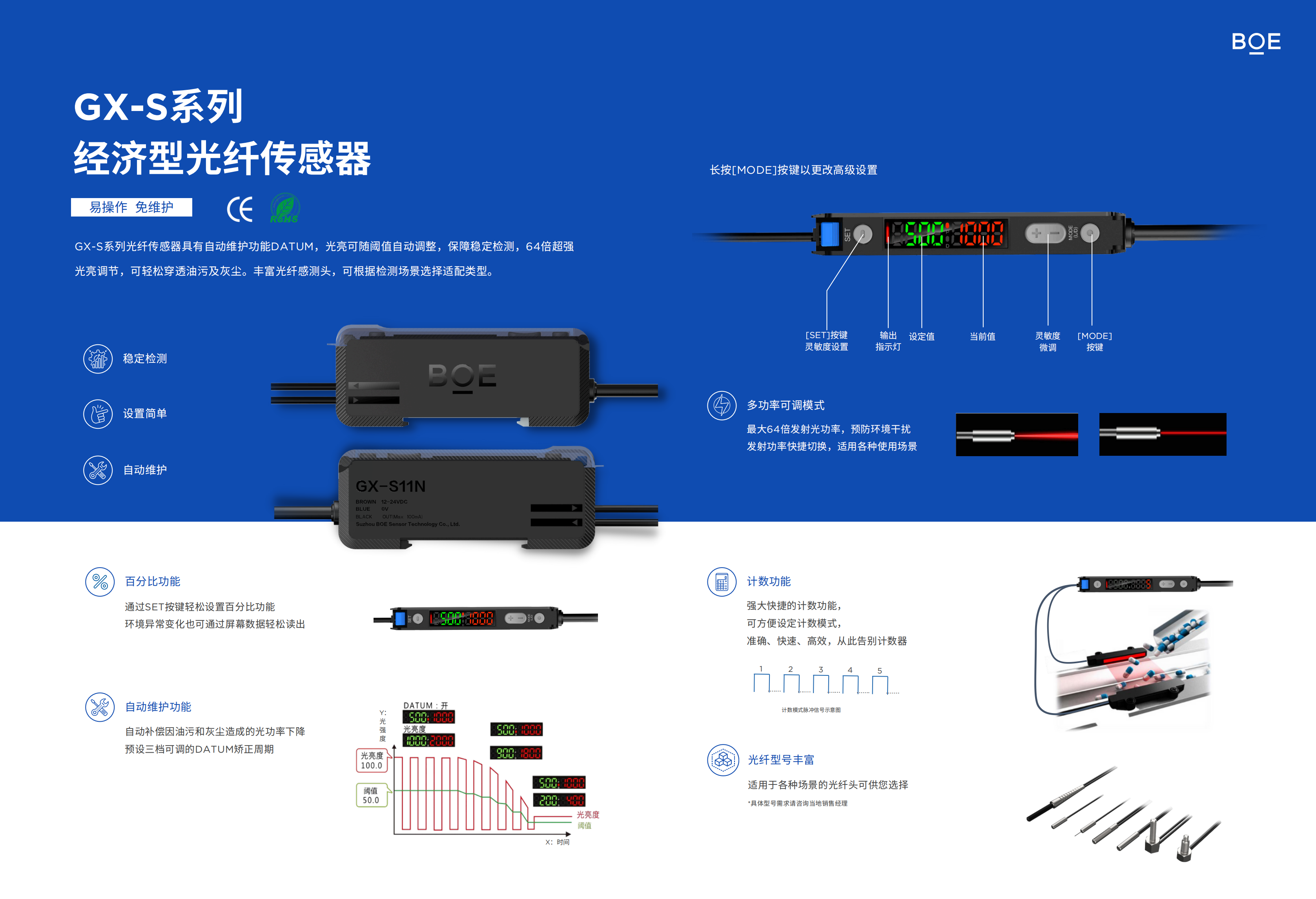 GS系列光纤传感器具有自动维护功能DATUM,,光亮可随阈值自动调整,,,,保障稳定检测,,,,超强光亮调节可轻松穿透油污及灰尘。。丰富光纤感测头,,,可根据检测场景选择适配类型