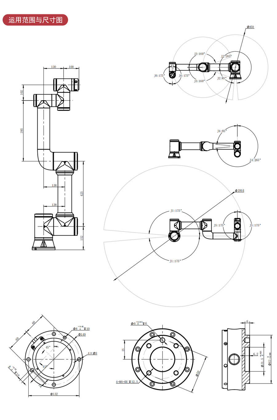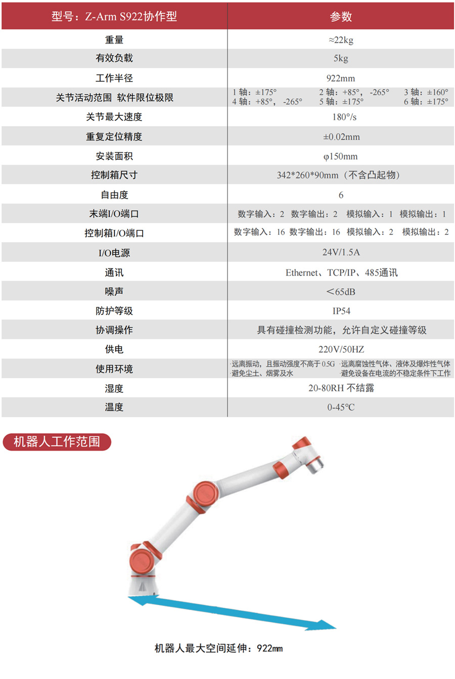 4. 高效率:工作半径922mm,,,关节速度最大速度可达180°/秒