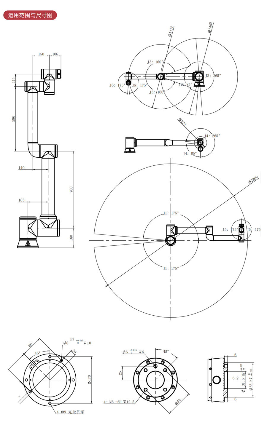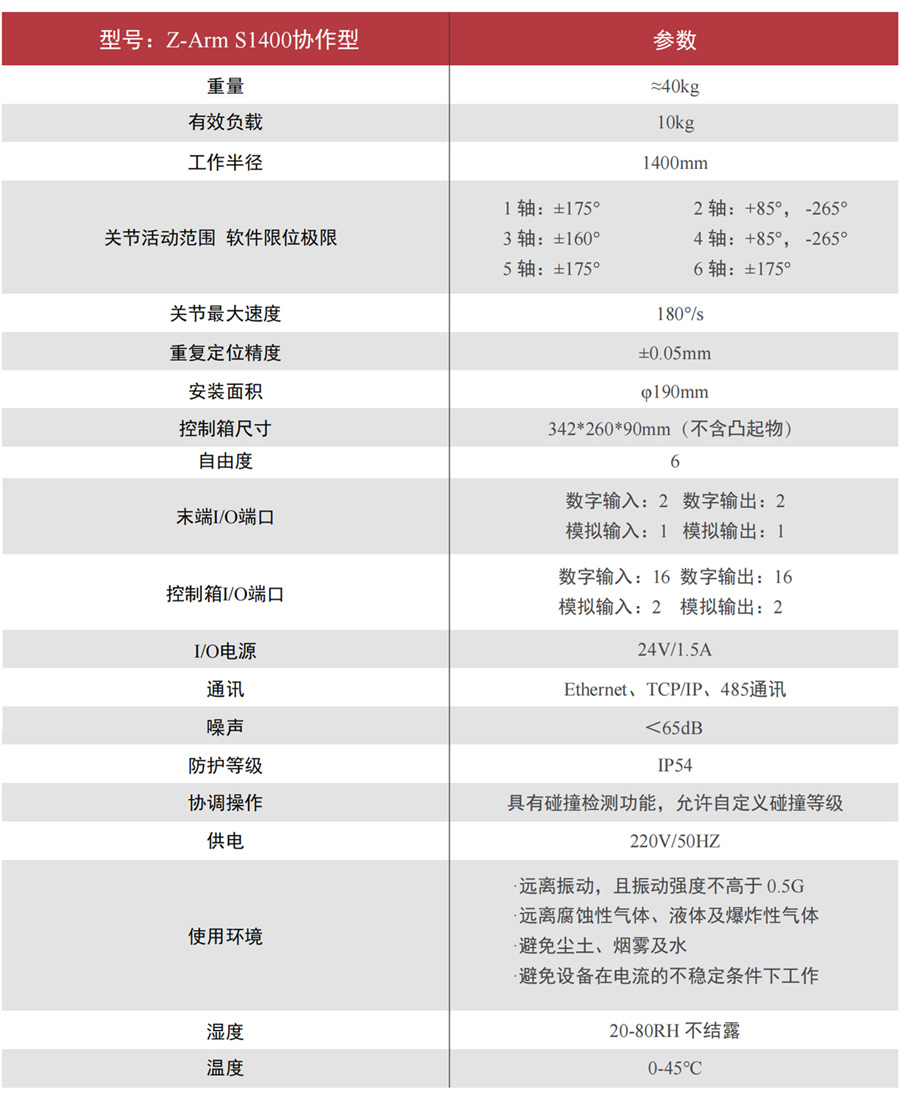 4. 高效率:工作半径1400mm,,关节速度最大速度可达180°/秒