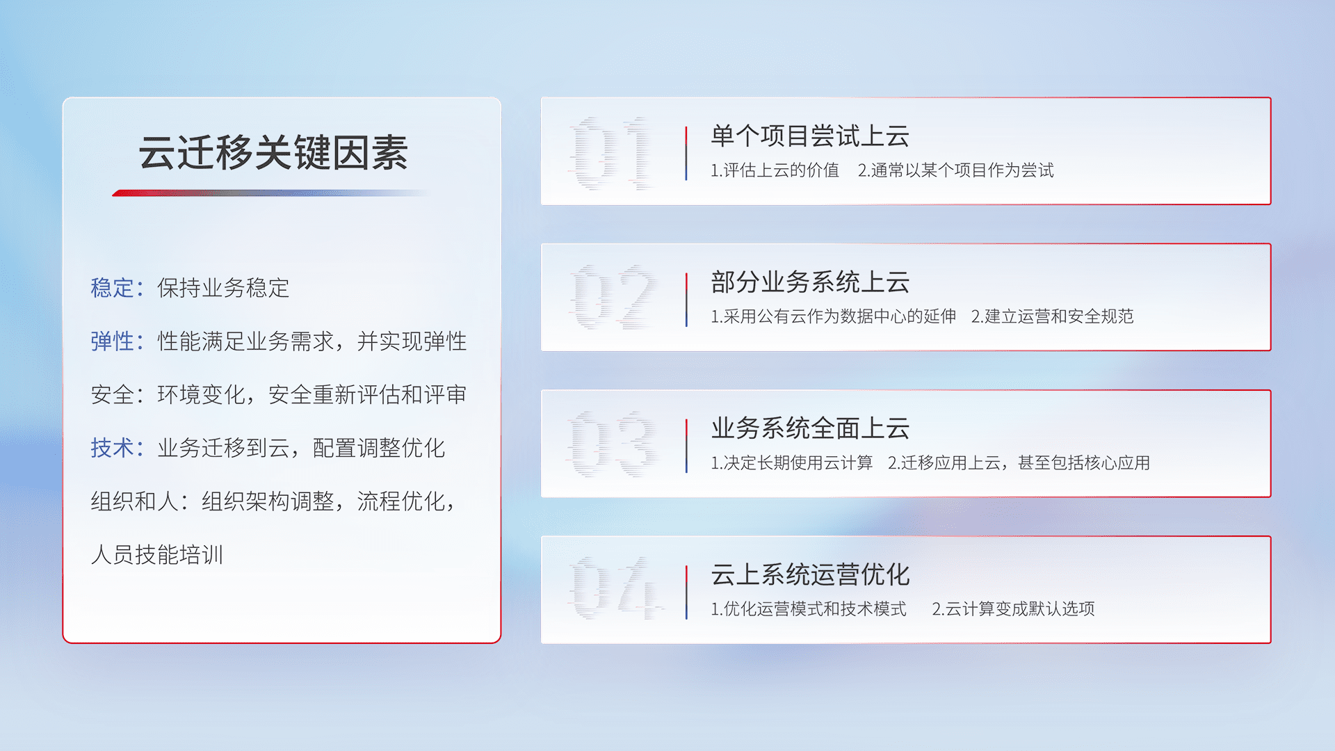 结合实际业务,,从规划设计、、、、云平台选型、、、云原生改造、、、数据迁移、、集成交付,,,迁移全过程为客户识别最佳上云路径,,,做好风险识别管理,,,设计网络架构、、、身份权限、、安全审计合规、、操作审计、、日志审计、、、、监控告警策略、、、多站点容灾设计等,,对云上基础设施进行整体规划,,,提升IT治理水平,,,以满足弹性、、高可用、、、高性能的需求。。。