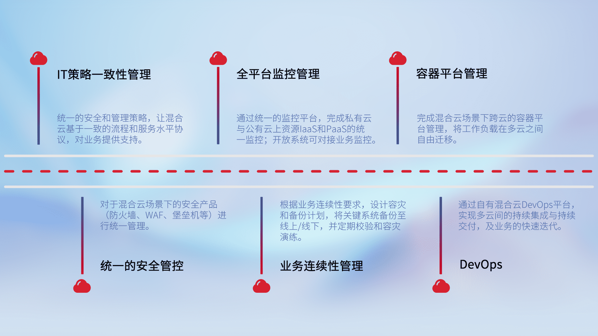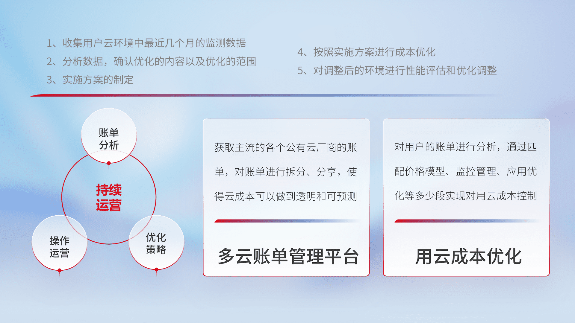 通过多云纳管,,以统一的资源数据模型把客户的云资源进行抽象和封装,,,,进而实现对多云资源的统一操作,,保障云资源管理的可靠性、、、、稳定性与可用性。。。量身定制化运维内容,,,配置、、开发运维、、、补丁管理、、备份、、监控、、、、认证和访问管理、、审计和日常巡检等,,保障在用云过程中的可靠度,,,稳定度以及高可用率。。。。